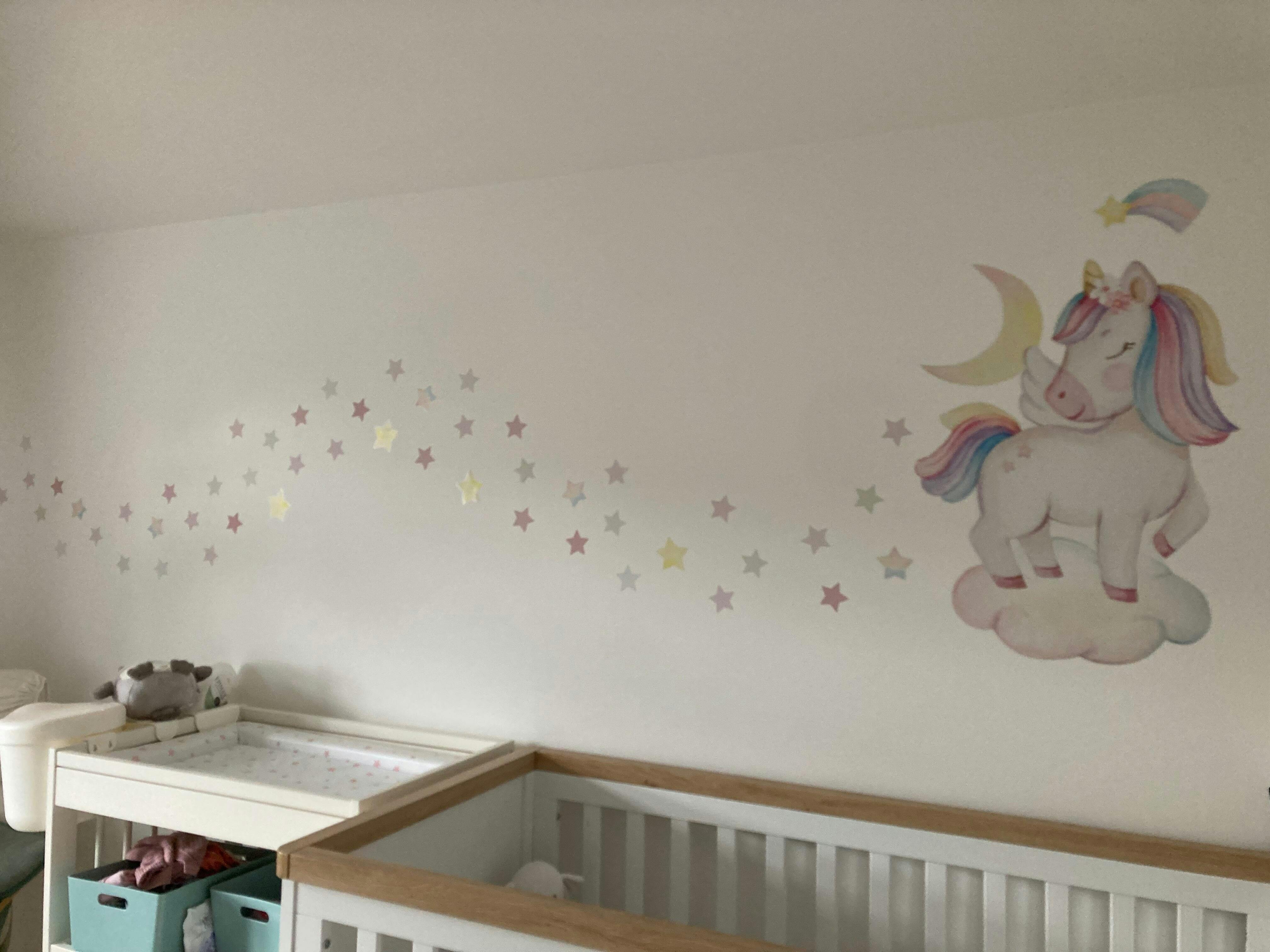 I had been looking at these for a while and decided to go for it. The unicorn is gorgeous, Love the style making it look painted on the wall. It was really easy to apply and I was able to peel off and reapply. It is quite a large sticker so take time to get it in position. I added some stars too and was able to put them around the walls of the nursery so it’s super cute! I wish we could buy more stars which match the ones which come with the unicorn as they catch the light and shine. Best decision ever xx