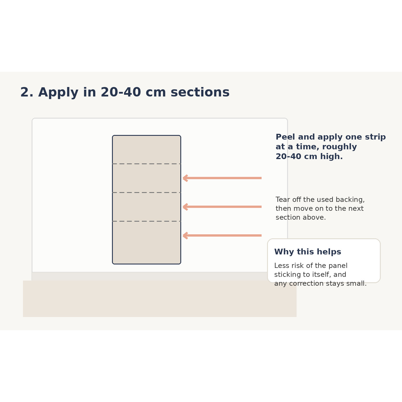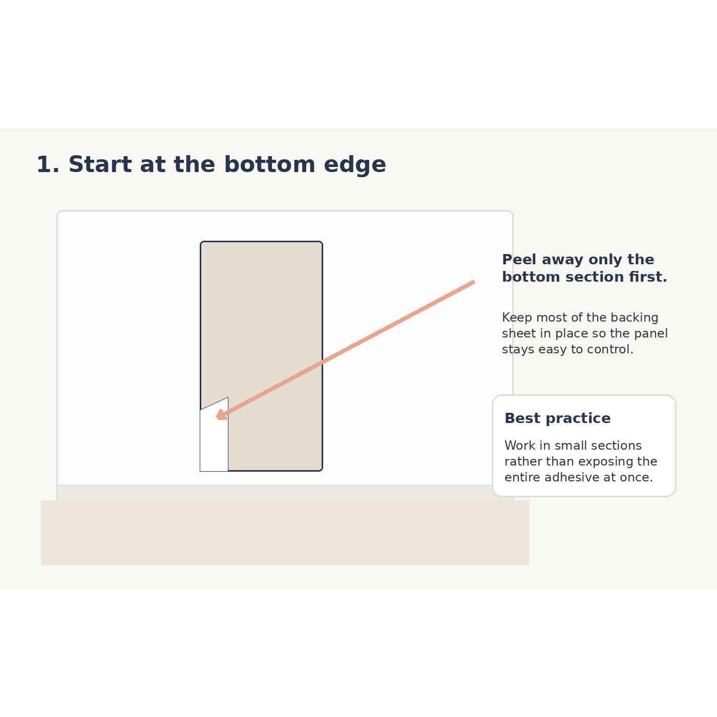 Work from the bottom up. Peel away only the bottom section of the backing sheet first, across the full width of the panel, in a strip of around 20–40 cm. Apply that section to the wall, smooth it down, then peel and apply the next section. Continue this way until the full panel is in place
