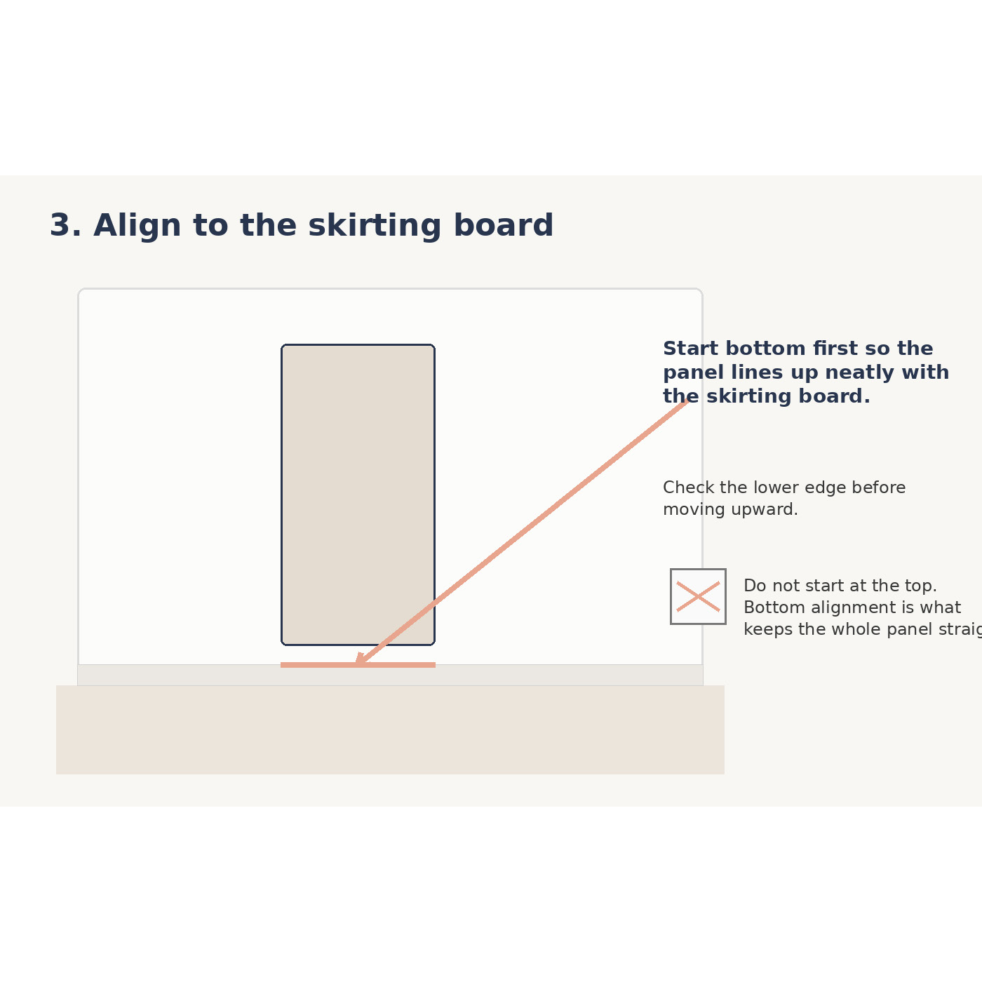 Why this works: It keeps the panel aligned with the skirting board, stops it sticking to itself, and makes the whole process much easier to control.