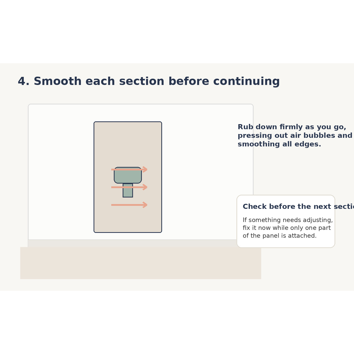 Rub down each section firmly once it is on the wall. Smooth out the edges and push out any bubbles immediately. If anything looks off, lift and adjust that section before moving on. This method means only one section needs correcting, rather than the whole panel.