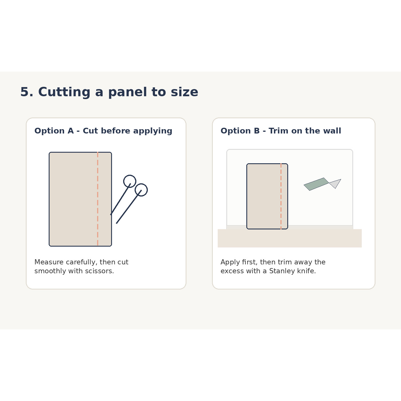 Each wall panel sticker measures 50 cm wide x 113 cm high and is easiest to apply by starting at the bottom and working upwards in manageable sections. This helps you line the panel up neatly with the skirting board, avoid the adhesive sticking to itself, and make small adjustments as you go.