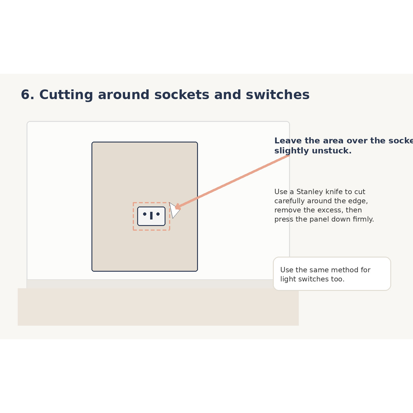 Apply the panel up to the socket or switch in the normal way, but leave the area covering the fitting slightly unstuck. Then use a Stanley knife carefully to cut around the edges. Remove the excess piece and press the panel down firmly around the fitting. The same method works for both plug sockets and light switches. Cut gradually rather than trying to do it all in one fast movement.