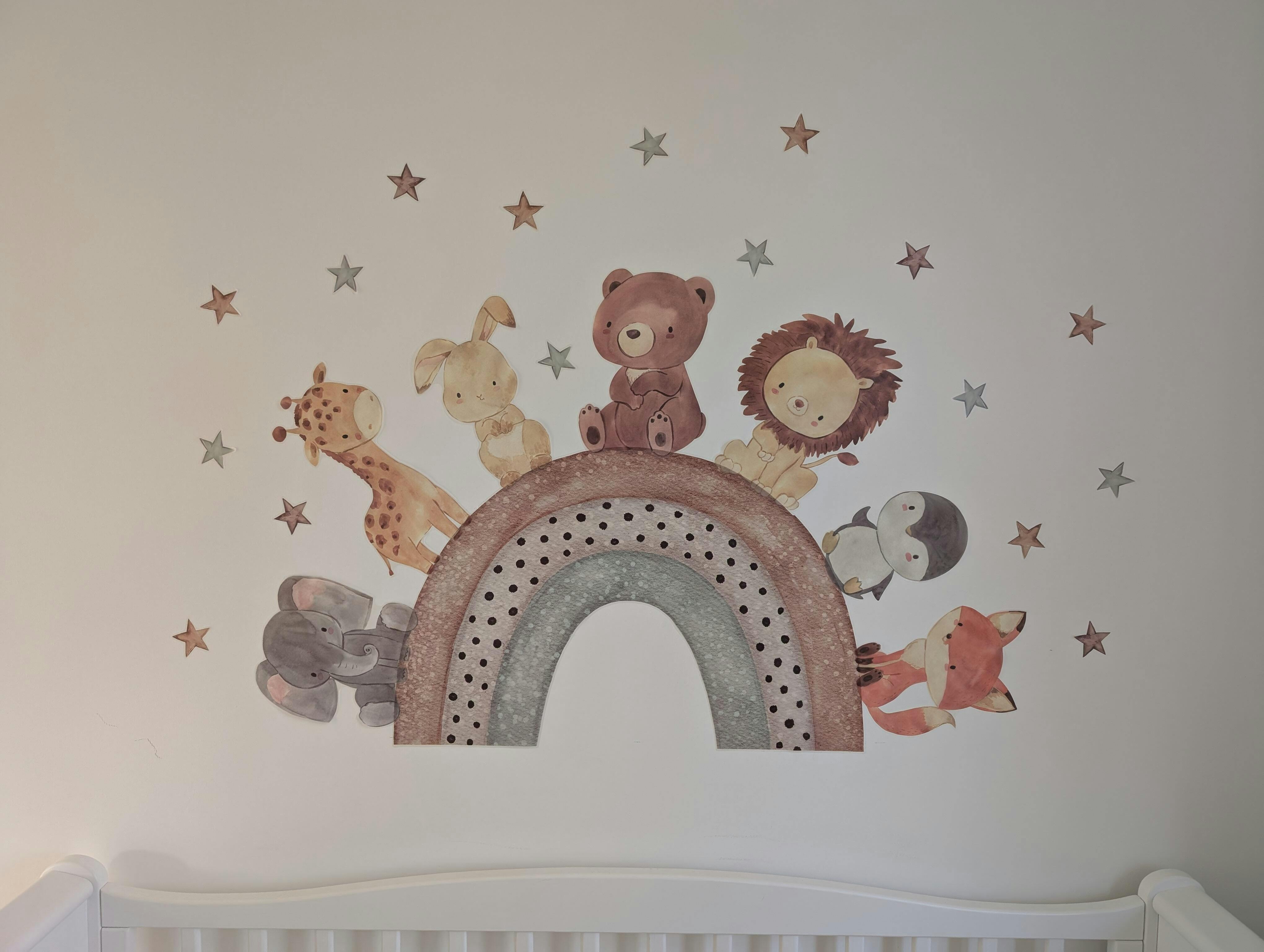 Step into a world where the charm of wildlife meets the enchantment of wonder with our Animals Around a Rainbow Wall Sticker for children's nurseries or playrooms. A captivating scene of friendly animals around a rainbow, ready to bring a touch of magic, learning, and colour into your child’s personal space.
