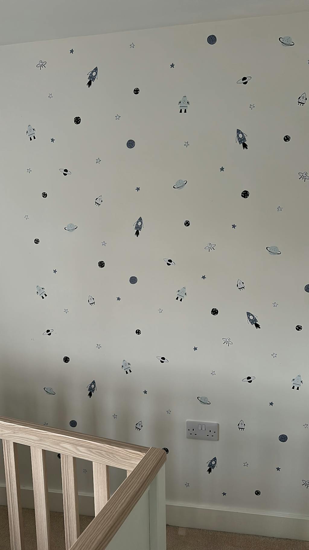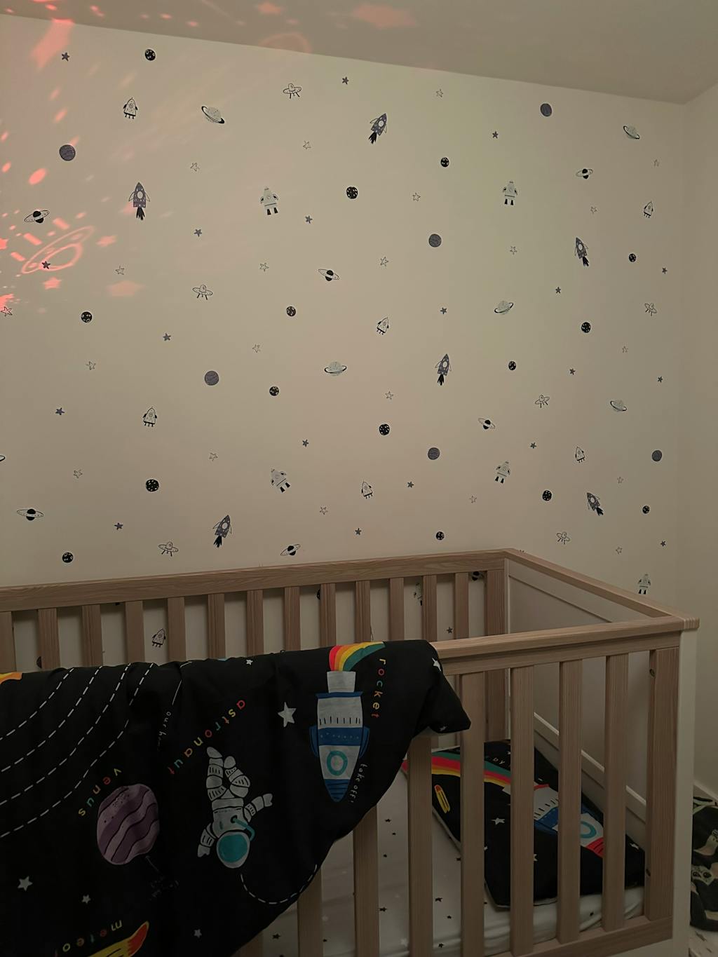 Transform your little astronaut's room into a universe of wonder with these space-themed wall stickers! Designed to spark imagination and encourage exploration, this set features rockets, planets, UFOs, stars, and moons in soft, soothing colours. Perfect for creating a dreamy cosmic vibe, these stickers are easy to apply, repositionable, and leave no sticky residue, making them ideal for renters or ever-evolving nursery decor.